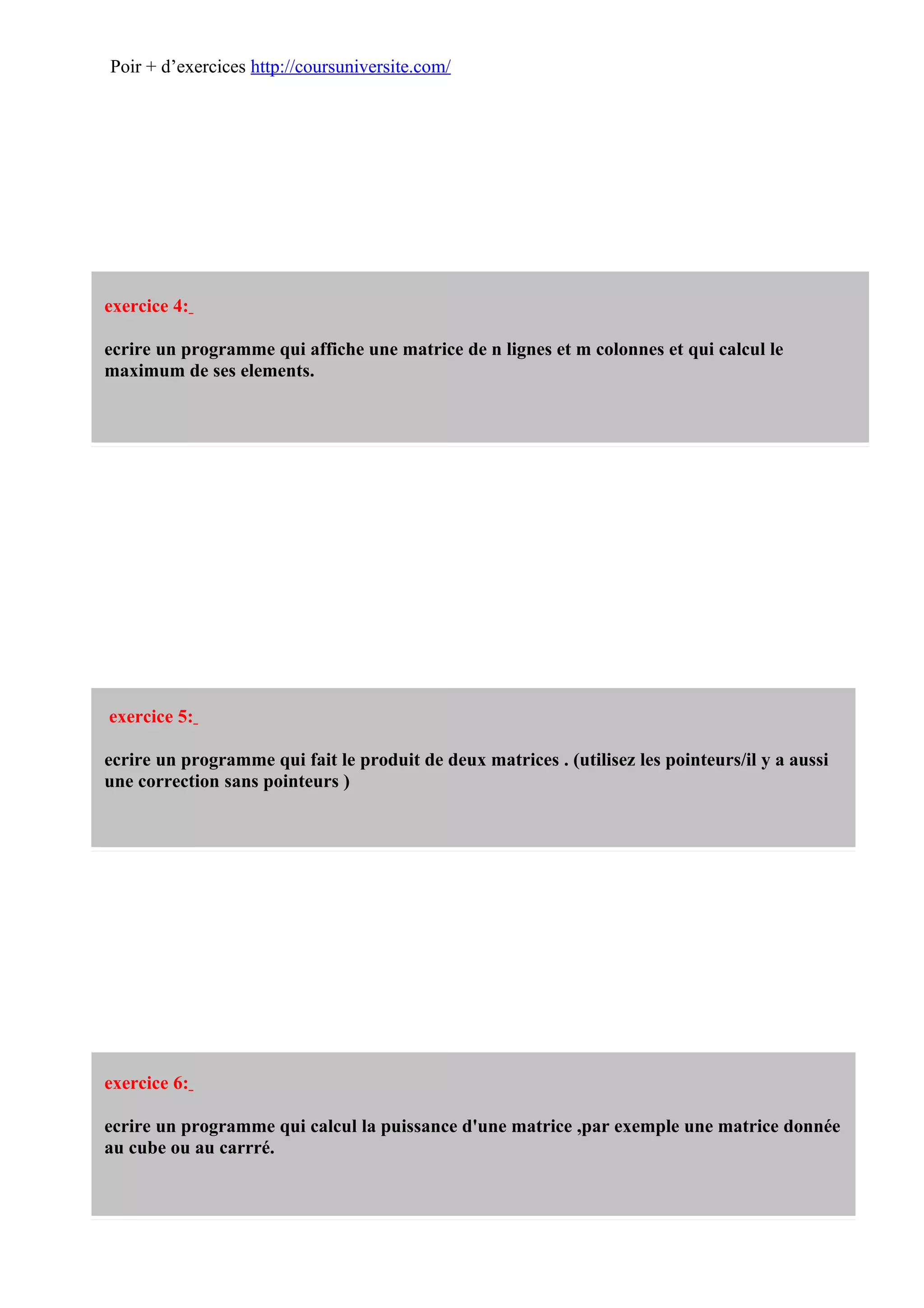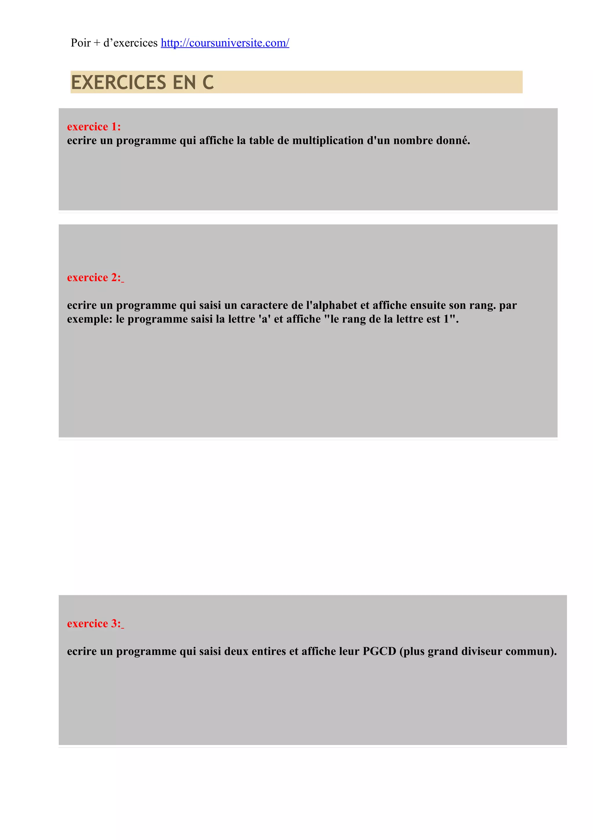 Le document contient une liste d'exercices de programmation en C, incluant des tâches comme l'affichage de tables de multiplication, le calcul de PGCD, la gestion de matrices, et la résolution d'équations. Chaque exercice propose une problématique à résoudre, illustrant divers concepts de la programmation. Les exercices sont accessibles via un site web pour plus d'exemples supplémentaires.