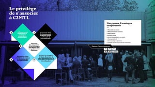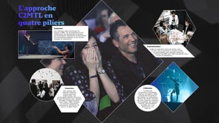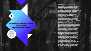Le document explore les différences entre les approches B2C et B2B, mettant en avant des alliances stratégiques axées sur la création de valeur ajoutée pour les marques. Il détaille également le processus de discussion créative et les diverses activations de la communauté autour de l'événement C2MTL. Enfin, l'approche 2014 vise à aller plus loin dans la communication co-brandée en collaborant avec des partenaires pour échanger des contenus et présenter des portraits d'individus créatifs.