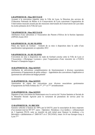 La séance du conseil d'arrondissement du 16 octobre 2012 inclut des points tels que la désignation d'un secrétaire, l'approbation de comptes rendus, et des rapports sur divers projets, notamment des conventions pour des opérations de financement immobilier et des subventions pour des associations. Plusieurs propositions d'acquisition de terrains et de mise à disposition de locaux ont été discutées, ainsi que l'attribution de subventions pour des projets éducatifs et culturels. Des décisions ont également été prises concernant le financement d'équipements de petite enfance et des événements locaux.