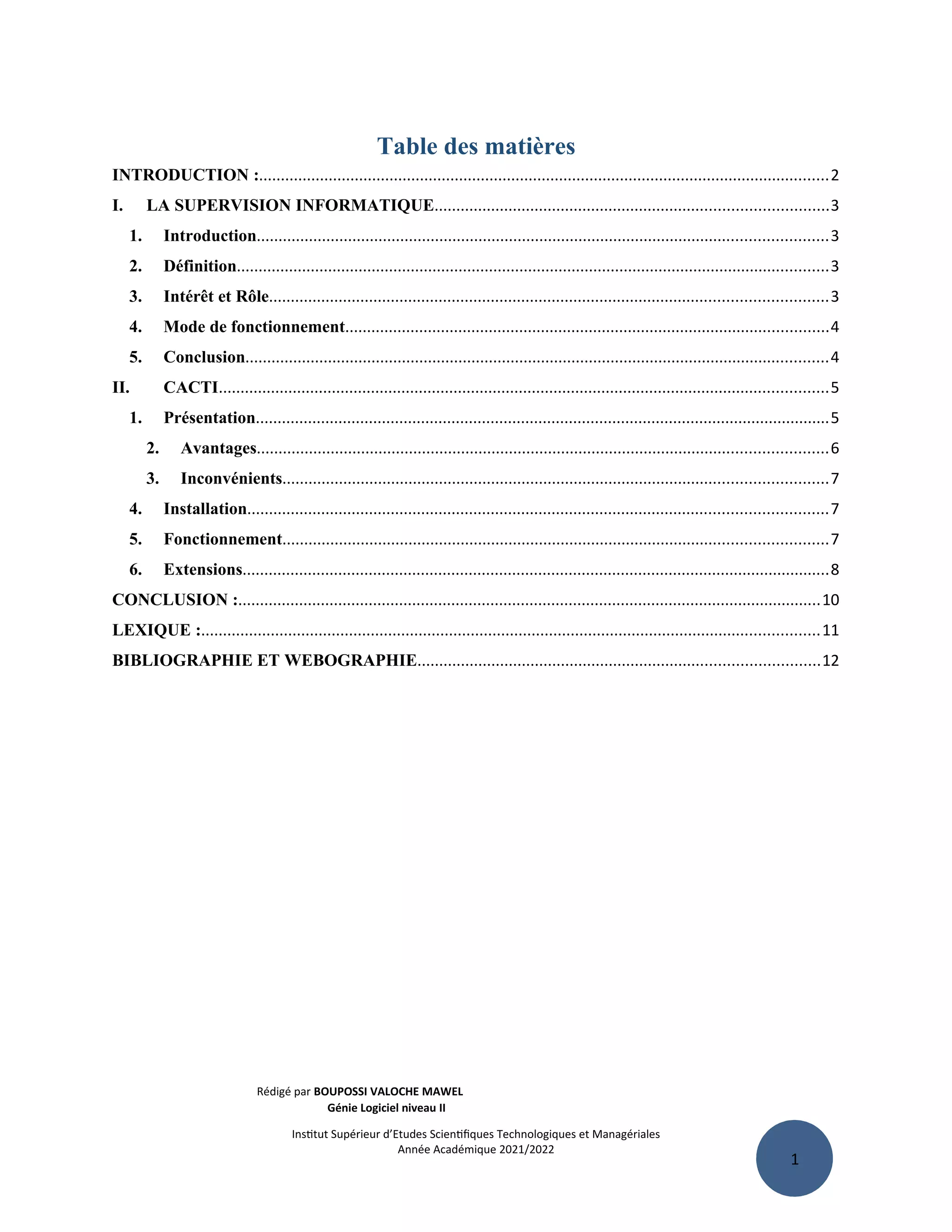 Le document traite de la supervision informatique, mettant en avant son importance pour la gestion des parcs informatiques afin de détecter et résoudre rapidement les problèmes. Il présente notamment le logiciel Cacti, un outil de supervision libre qui permet de collecter et visualiser des données sur les performances des réseaux. Bien que Cacti ait de nombreux avantages, tels que la mesure de la disponibilité et la gestion des utilisateurs, il présente également des inconvénients, notamment une configuration parfois fastidieuse.