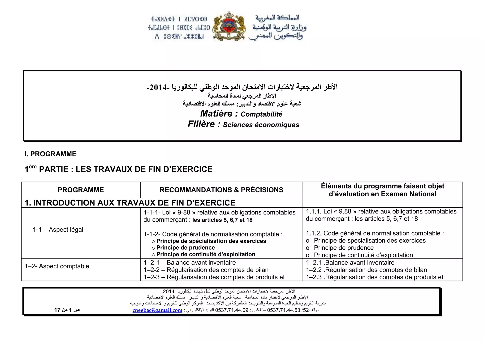 Le document présente le cadre de référence pour l'examen national de la matière de comptabilité au baccalauréat, détaillant les aspects légaux et comptables des travaux de fin d'exercice. Il aborde divers sujets tels que la régularisation des stocks, l'amortissement et la comptabilisation des opérations comptables. L'objectif est de fournir aux enseignants un guide structuré pour évaluer les connaissances des élèves en sciences économiques et de gestion.