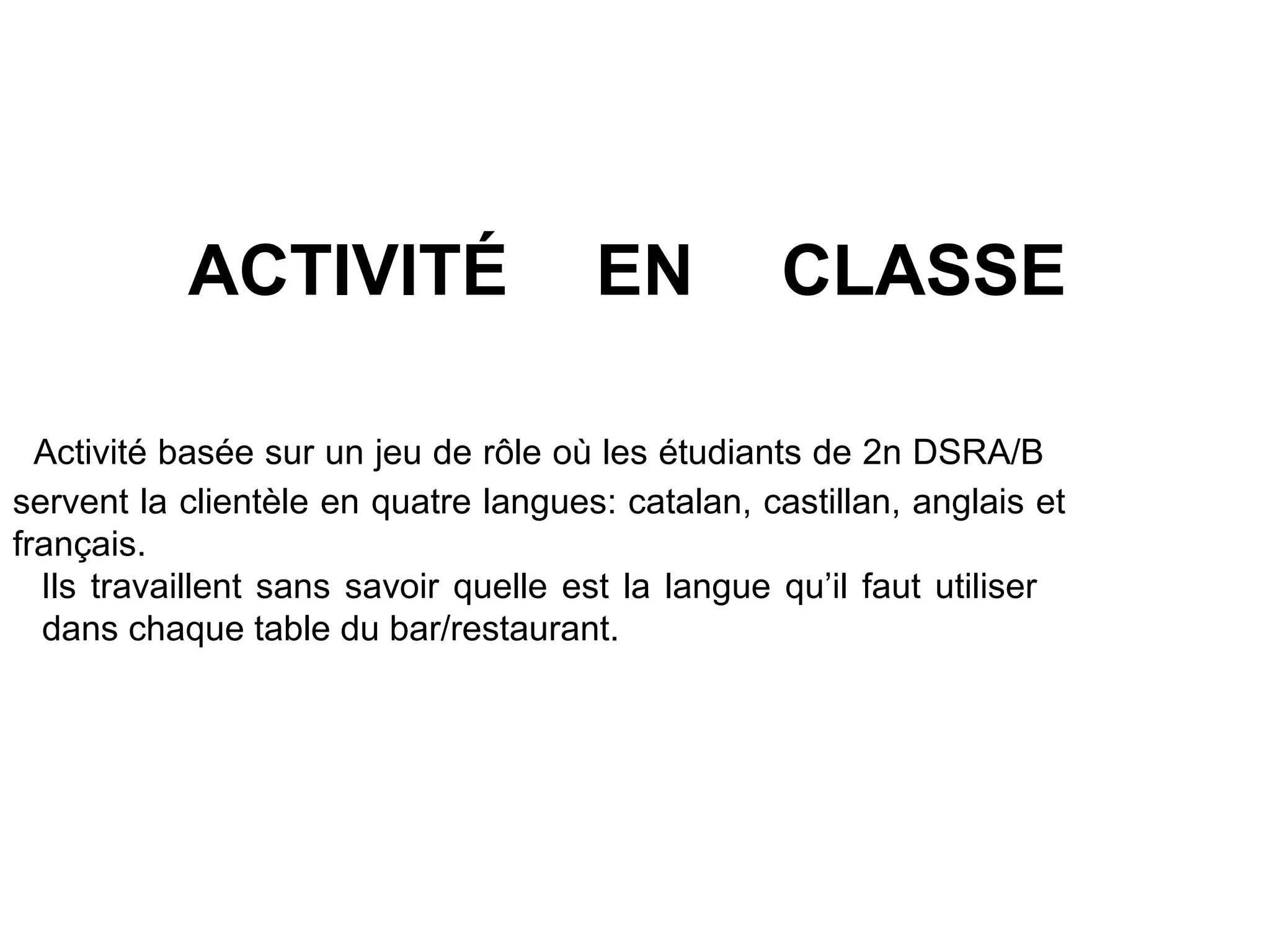 L'activité en classe est un jeu de rôle où des étudiants servent la clientèle en quatre langues. Les points forts incluent une bonne attitude d'accueil et une initiative pour aider les clients, tandis que les points faibles concernent le manque de politesse et des problèmes de communication. Une évaluation de la pratique a été faite pour aider les étudiants à identifier leurs points forts et faibles afin d'améliorer leurs compétences orales en situation réelle.