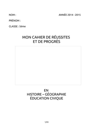 Le document est un cahier de réussites et de progrès en histoire-géographie pour une classe de 5ème, couvrant diverses thématiques historiques et géographiques. Il contient des chapitres sur l'expansion de l'islam, l'occident féodal, les bouleversements de la Renaissance et les enjeux du développement durable, ainsi que des problématiques, des capacités à acquérir et des repères chronologiques. Ce livret sert de guide pour l'apprentissage des événements clés et des concepts importants de l'histoire et de la géographie.