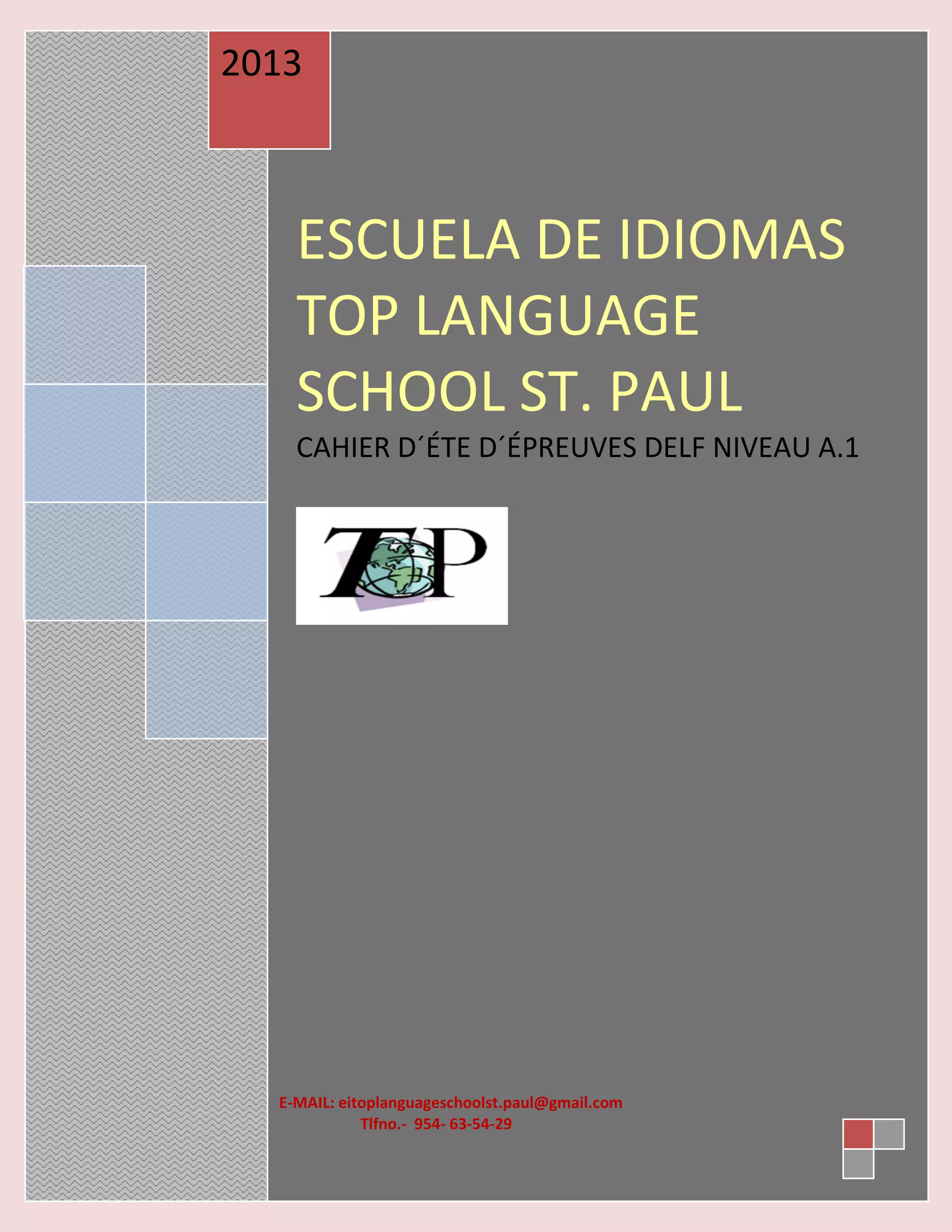 Le document est un cahier d'été de l'École de Langues Top Language School, axé sur les épreuves DELF niveau A1 de 2013. Il comprend des exercices de compréhension écrite, des annonces de chambres à louer à Nice, des invitations à des événements, ainsi que des activités de production écrite. Les tâches visent à développer les compétences linguistiques des apprenants à travers divers contextes pratiques.