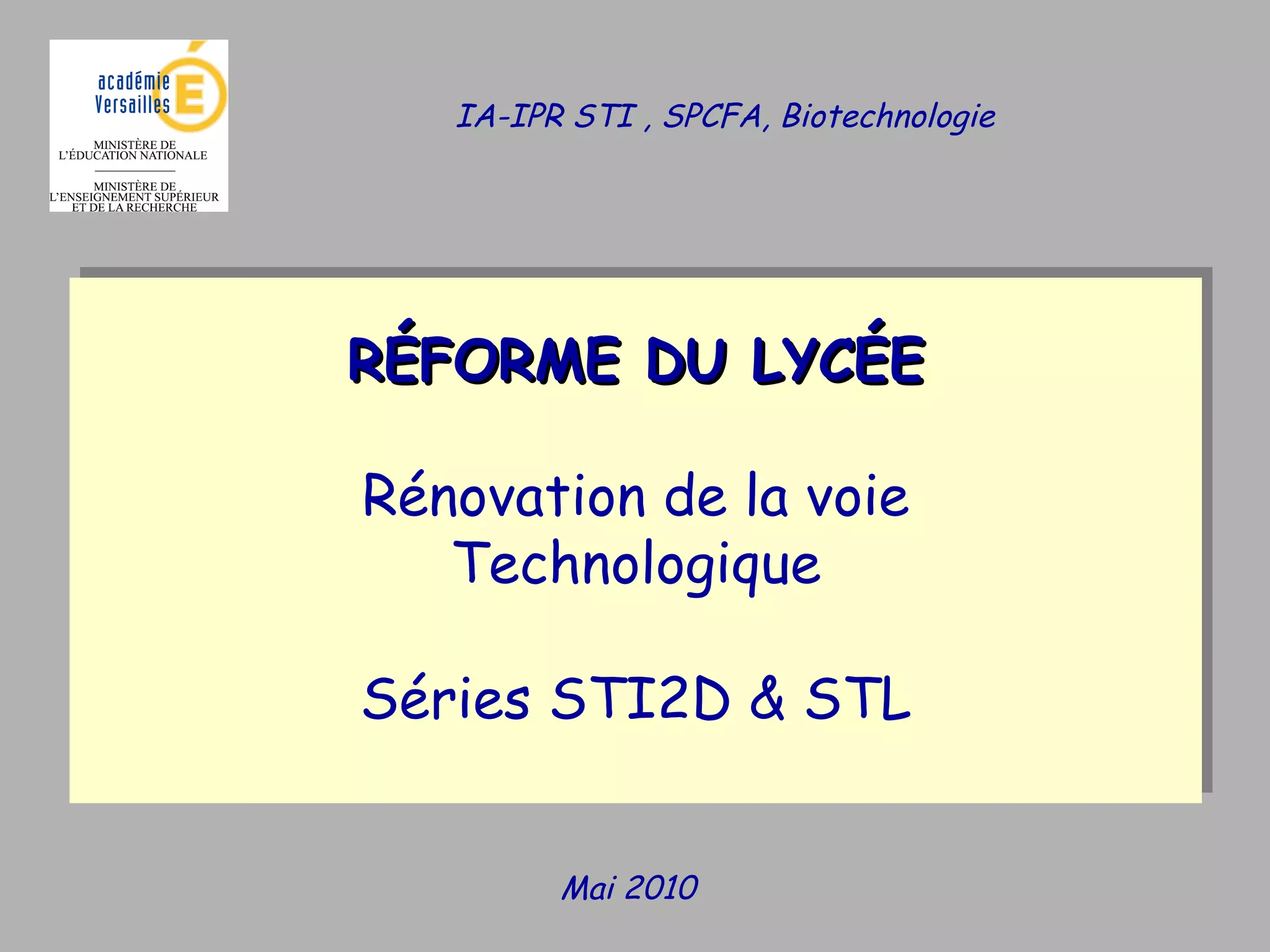 La réforme du lycée en 2011 vise à moderniser les séries technologiques STI et STL pour promouvoir les formations scientifiques et techniques, en améliorant leur attractivité et en élargissant les choix d'orientation post-bac. Les nouveaux baccalauréats technologiques offrent des enseignements renforcés et transversaux, tout en maintenant une forte dimension technologique, afin de favoriser l'insertion professionnelle et les poursuites d'études supérieures. Un plan d'accompagnement national et académique est mis en place pour soutenir les enseignants durant cette transition.