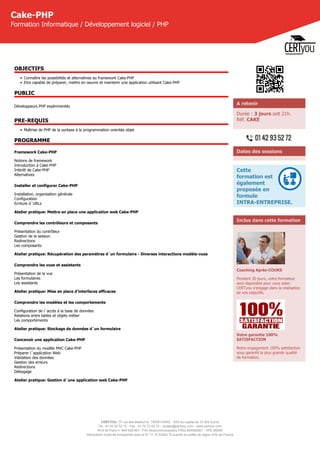 Certyou propose une formation de 3 jours sur le framework CakePHP, destinée aux développeurs PHP expérimentés. Le programme couvre l'installation, la configuration, et la création d'applications web avec CakePHP, ainsi que des ateliers pratiques. Un coaching post-formation de 30 jours est inclus pour garantir le soutien aux participants.