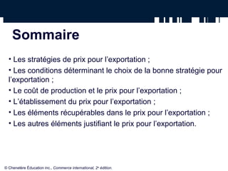 Le chapitre 12 traite de la fixation des prix pour l'exportation en abordant diverses stratégies telles que la pénétration, l'écrémage, les prix fixes et variables. Il souligne l'importance de la compréhension des coûts de production, des conditions du marché et des méthodes de calcul du prix pour établir un prix compétitif à l'export. Les facteurs influençant le prix incluent les droits de douane, les conditions de paiement et la concurrence sur le marché visé.