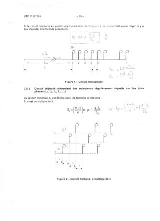 Le document traite des spécifications techniques liées à la protection des installations électriques, en insistant sur l'utilisation de fusibles et de disjoncteurs, ainsi que sur les limites des chutes de tension pour différents types de circuits. Il fournit des formules pour déterminer les sections minimales des conducteurs en fonction des courants absorbés et des configurations spécifiques, y compris les circuits monophasés et triphasés. De plus, il aborde les exigences de protection contre les courts-circuits et les méthodes de vérification associées.