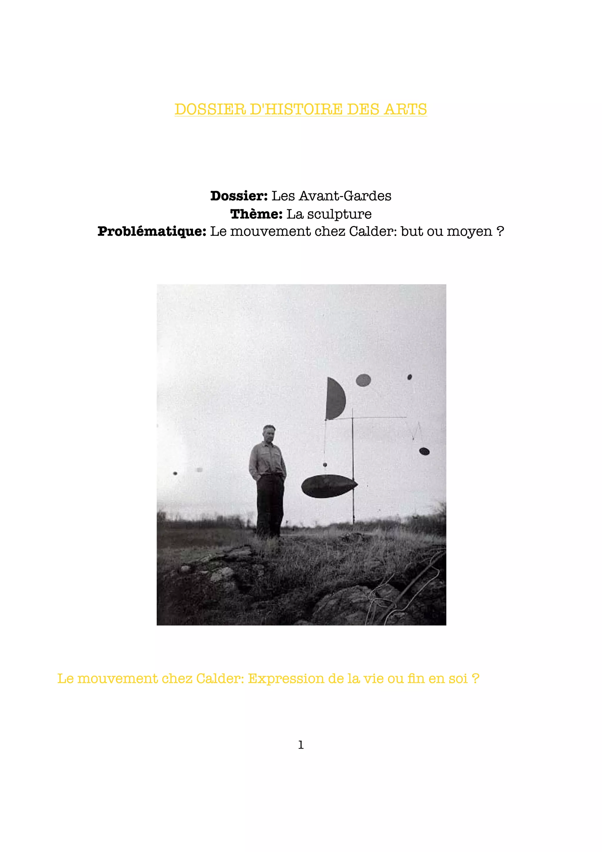 Le document présente l'œuvre d'Alexander Calder, célèbre pour ses sculptures en fil de fer et ses mobiles abstraits. Il examine comment Calder utilise le mouvement comme moyen d'expression artistique et d'équilibre, entre la mécanique et l'émotion. La conclusion souligne que Calder redéfinit le mouvement, le considérant non plus simplement comme un moyen, mais comme un élément central de son art.