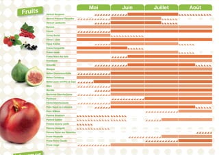 Le document présente un calendrier saisonnier des fruits et légumes, indiquant les périodes de disponibilité de chaque produit tout au long de l'année. Il inclut des informations sur divers types de fruits et légumes, leurs calibres et poids, ainsi que les saisons de début et de fin pour chaque variété. L'accent est mis sur l'importance de consommer des produits locaux et de saison.