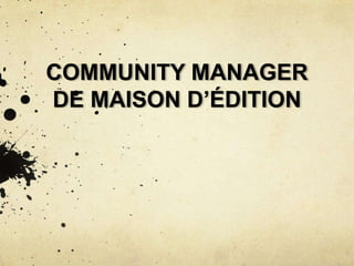 Le community manager (CM) joue un rôle essentiel dans le secteur de l'édition, aidant les entreprises à s'adapter aux nouvelles technologies et aux exigences du marché numérique. Sa mission englobe la gestion des réseaux sociaux, l'animation de communauté, et la collecte de données sur les consommateurs pour renforcer la relation entre les marques et leurs clients. Alors que ce métier est relativement nouveau, il est nécessaire pour que les maisons d'édition évoluent et restent pertinentes dans un environnement en constante mutation.