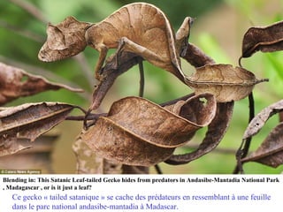 Le document présente divers animaux et leur capacité remarquable à se camoufler dans leur environnement naturel. À travers des exemples de reptiles, d'amphibiens et d'autres créatures, il illustre comment ces espèces se mélangent à leur habitat pour échapper aux prédateurs. Chaque exemple met en avant un aspect fascinant du camouflage dans la nature.