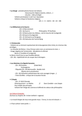 Le document analyse 'Candide' de Voltaire en tant que conte philosophique, mettant en avant des caractéristiques narrative et stylistiques, telles que l'absence de vraisemblance et l'utilisation d'hyperboles. Il aborde la satire de l'optimisme, des institutions religieuses et militaires, et d'une aristocratie décadente, tout en soulignant l'importance des valeurs philosophiques et du travail. La conclusion exhorte à 'cultiver notre jardin' comme métaphore de l'engagement personnel contre le mal.