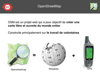 OpenStreetMap (OSM) est un projet de cartographie collaborative visant à créer une carte libre du monde, s'appuyant sur le travail de volontaires. Il répertorie à la fois des éléments visibles tels que routes et bâtiments, ainsi que des caractéristiques non visibles, sans inclure d'informations sur les populations. Le projet a connu un développement significatif, notamment en Haïti après le séisme de 2010, avec plusieurs initiatives locales pour former des jeunes et garantir la pérennité des connaissances cartographiques.