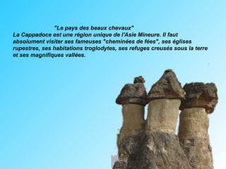 La Cappadoce est une région fascinante d'Asie mineure, célèbre pour ses 'cheminées de fées', ses églises rupestres et ses habitations troglodytes. Les visiteurs peuvent explorer ses magnifiques vallées et découvrir des refuges souterrains uniques. Pour ceux qui souhaitent se reposer après des excursions, des hôtels troglodytes sont également disponibles.