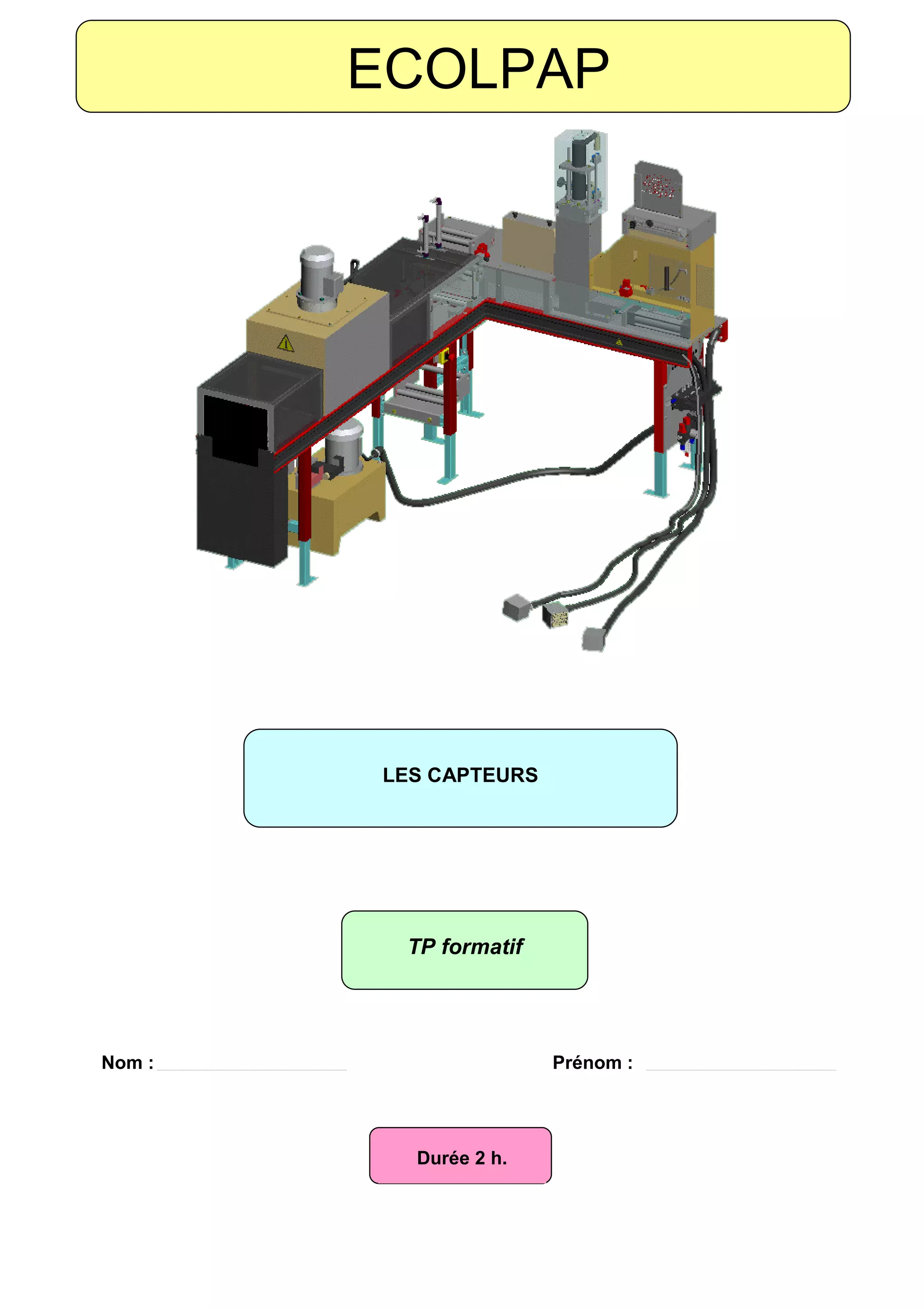 Le document décrit un exercice pratique d'identification et d'inventaire des capteurs pour une intervention de maintenance, prévu sur deux heures. Les élèves doivent suivre des étapes spécifiques pour colorier les connexions des capteurs et consigner leurs observations, avec un contrôle du professeur à chaque étape. Des ressources et du matériel sont fournis, notamment un système informatique et des fiches de travail.