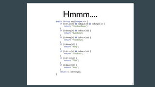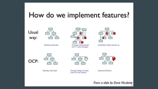 Le document aborde la méthode de développement TDD et le principe de l'ouverture/fermeture (OCP) à l'aide du kata FizzBuzz. Il présente les avantages du TDD, notamment l'amélioration du code et la réduction des débogages, et explique comment intégrer de nouvelles fonctionnalités tout en respectant OCP. Des exemples de règles supplémentaires et de planification de refactoring sont également discutés pour maintenir un design efficace et éviter l'over engineering.