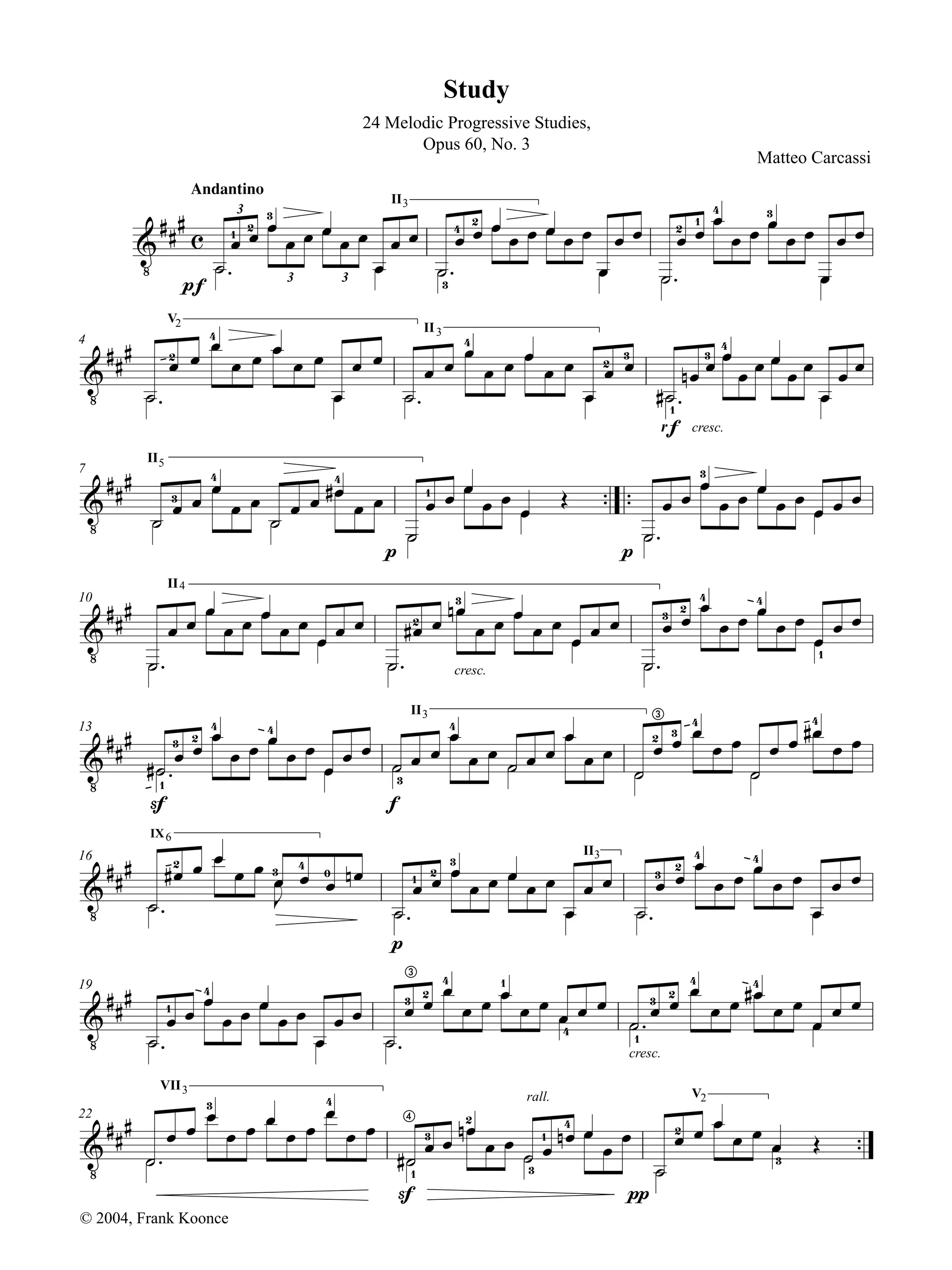 Le document présente des études progressives mélodiques, spécifiquement l'opus 60, numéro 3 de Matteo Carcassi. Il contient des notations musicales détaillées pour l'étude, marquées par des indications de dynamique et de nuances. Ces études visent à développer les compétences techniques et musicales des guitaristes.