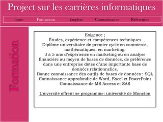 Le document présente un projet sur les carrières informatiques, décrivant diverses professions telles que les analystes de bases de données, webmestres, consultants, et développeurs, ainsi que leurs exigences de formation et salaires. Il inclut des commentaires personnels de l'auteur sur chacune des carrières, exprimant des préférences et aspirations professionnelles. Les programmes associés sont majoritairement offerts par l'Université de Moncton.