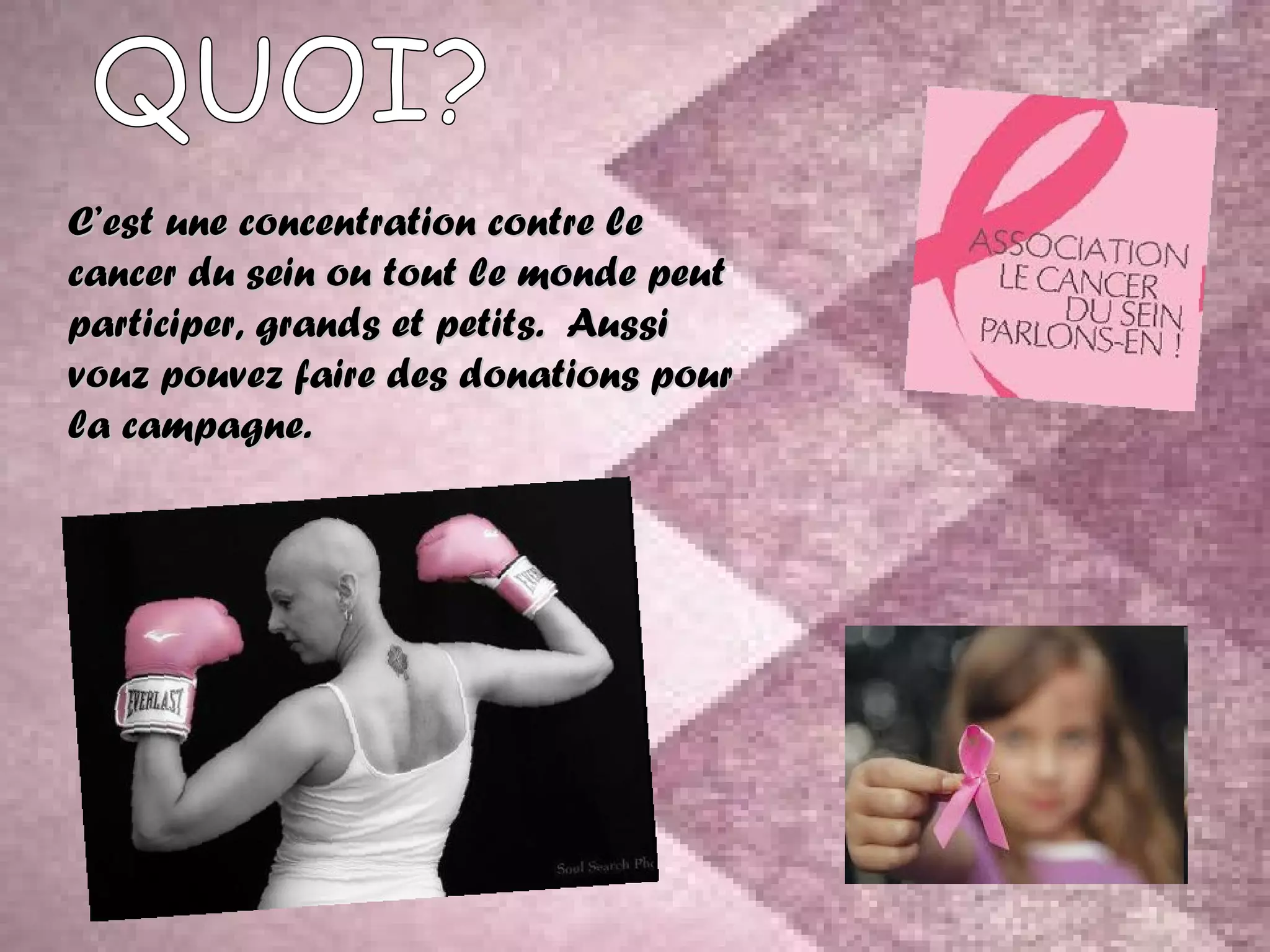 Une concentration contre le cancer du sein est organisée par la Fondation mondiale de cancer du sein le 19 octobre à 18h30 sur la place de la Constitution. Tout le monde peut participer et faire des dons pour la campagne. L'événement vise à sensibiliser les jeunes, hommes et femmes, à cette maladie.