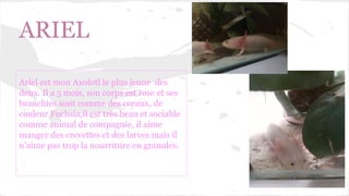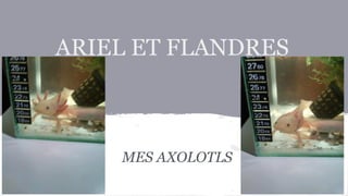 Ariel et Flandres sont des axolotls, Ariel étant le plus jeune à 5 mois et Flandres le plus âgé à 6 mois. Tous deux ont un corps rose et des branchies colorées, et ils se montrent sociables et affectueux. Leur alimentation favorite consiste en crevettes et larves, bien qu'ils n'apprécient pas la nourriture en granules.