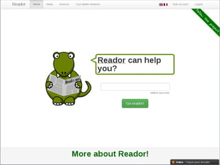 Le document présente reador.net, un outil open-source pour le filtrage et l'organisation des nouvelles personnelles. Il met en avant plusieurs solutions de gestion de l'information, telles que Google News et Feedly. Des options de filtrage automatique et de clustering s’offrent aux utilisateurs pour optimiser leur veille.