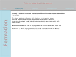 Le document présente un projet sur les carrières en informatique, détaillant les prérequis, le nombre d'années d'études, les institutions offrant ces programmes, les carrières potentielles et les variations de salaire. Il inclut également les préférences personnelles de l'auteur pour certaines carrières, notamment son intérêt pour le physiothérapeute et l'architecture paysagiste, tout en exprimant un manque d'intérêt pour les carrières informatiques. Il se termine par une bibliographie de sources consultées pour la recherche.