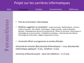 Le document présente un projet sur les carrières informatiques incluant des formations, des emplois, et des commentaires sur différents métiers tels que formateur en informatique, spécialiste de la bioinformatique, réparateur de matériel électronique, programmeur informatique et analyste des systèmes de gestion. Chaque section détaille les titres de la formation, les matières suggérées, les universités offrant ces programmes, les salaires et des réflexions personnelles sur l'intérêt envers ces carrières. Le projet est réalisé par Cassandra Roussel dans le cadre d'un cours d'informatique et société à l'école l'envolée, daté du 9 mars 2015.