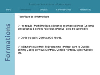 Le document présente divers débouchés professionnels dans le domaine de l'informatique, y compris analystes de bases de données et programmeurs. Les salaires et descriptions de chaque emploi sont mentionnés, ainsi que les prérequis des formations nécessaires. L'auteur exprime ses préférences personnelles et son intérêt pour certaines carrières tout en excluant celles qui demandent trop de temps devant un ordinateur.