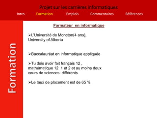 Le document présente un projet sur les carrières en informatique, en détaillant plusieurs professions telles que formateur en informatique, programmeur, ingénieur informaticien, chef de projet et réparateur de matériel électronique, ainsi que les exigences, salaires et taux de placement associés. Des statistiques sur les études requises et les entreprises associées à chaque carrière sont fournies, accompagnées de commentaires personnels de l'auteur sur ses préférences professionnelles. Les informations sont basées sur des recherches et des références de carrière en informatique.