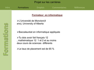 Le document présente différentes carrières en informatique, notamment leurs formations requises, salaires et taux de placement. Il inclut des rôles comme formateur en informatique, programmeur, ingénieur informaticien, chef de projet et réparateur de matériel électronique, chacun avec des exigences spécifiques et salaires variés. L'auteur exprime également ses préférences personnelles et ses motivations pour ces métiers.