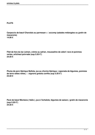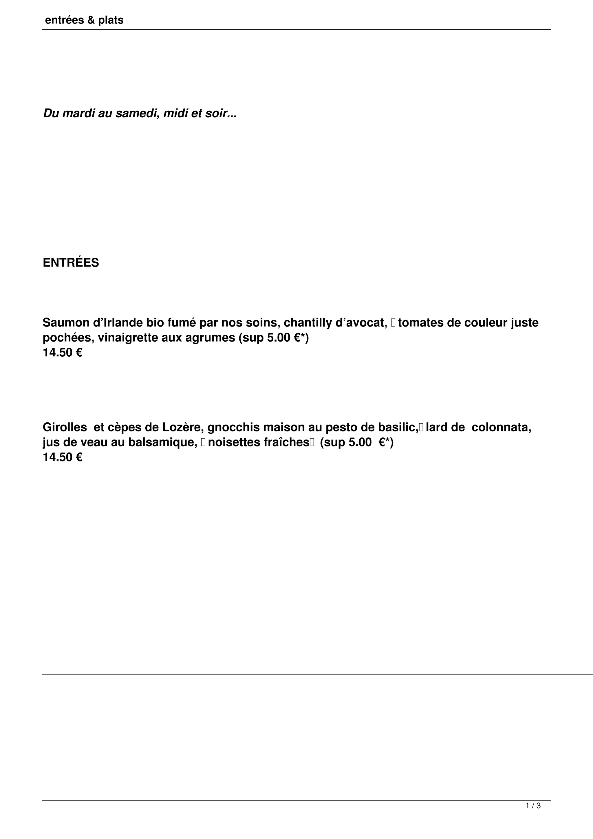 Le document présente le menu d'un restaurant, offrant divers plats et entrées du mardi au samedi, midi et soir. Les options incluent des entrées comme le saumon d'Irlande et des plats principaux tels que le carpaccio de boeuf et le filet de fera, avec des prix indiqués. Des suppléments sont mentionnés pour certains éléments, et il est précisé que les cuissons ne seront pas modifiées.