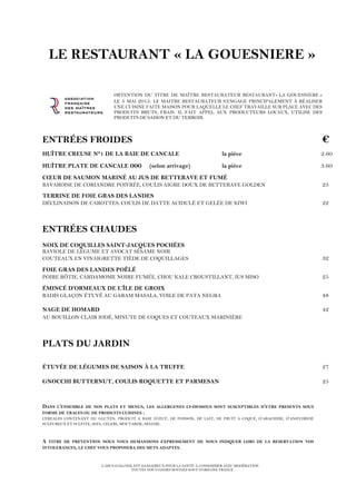 Le restaurant 'La Gouesniere', distingué par le titre de maître restaurateur depuis 2015, met l'accent sur une cuisine maison à partir de produits frais et locaux. Les menus incluent des plats élaborés tels que des fruits de mer, des viandes et des desserts, disponibles à divers prix, tout en prévenant des allergies alimentaires. Il est également mentionné que l'abus d'alcool est dangereux pour la santé, avec une offre de vins pour accompagner les repas.