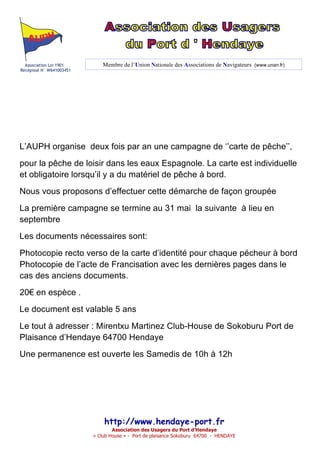 L'association loi 1901 organise semestriellement une campagne pour obtenir une carte de pêche individuelle obligatoire pour les activités de loisir dans les eaux espagnoles. Les pêcheurs doivent soumettre des documents spécifiques et un paiement de 20€ pour obtenir la carte, valable 5 ans. Les démarches peuvent être effectuées collectivement, avec un centre d'accueil disponible le samedi matin.