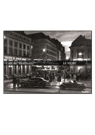 Le document décrit le menu du café 'Vieil Ouchy', incluant une variété d'entrées, plats de viande, fondues, rösti, et desserts. Chaque section présente des spécialités telles que le hachis parmentier à l’éffilochée de canard et différents types de fondues. Le café propose également des glaces artisanales et est situé à Lausanne.