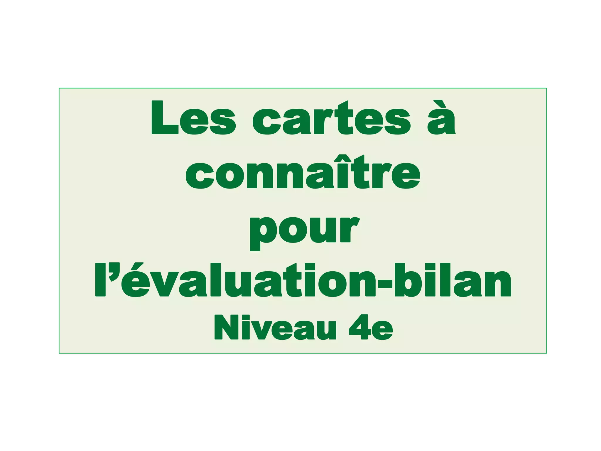 Le document fournit une liste de cartes essentielles pour l'évaluation-bilan en classe de 4e, incluant les continents, océans, lignes imaginaires, grandes métropoles, zones climatiques et montagneuses. Il aborde également les espaces faiblement peuplés, les grands foyers de populations, les cinq États les plus peuplés et les grands fleuves. Ces éléments sont cruciaux pour comprendre la géographie mondiale.