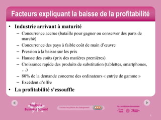 Le document examine la stratégie d'entreprise de Dell face à une baisse de profitabilité due à une concurrence accrue et à des changements de marché. Il détaille la chaîne de valeur de Dell, mettant en avant ses activités principales, telles que la logistique, la production et la commercialisation, ainsi que son modèle de vente direct unique. Enfin, il souligne les défis récents de l'entreprise, notamment le passage à des ventes indirectes tout en conservant un avantage concurrentiel basé sur la personnalisation et la gestion des stocks.
