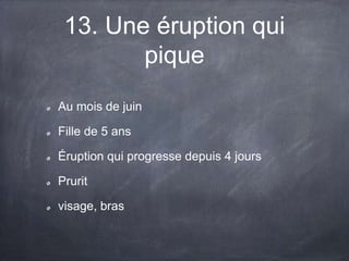 Le document traite d'une éruption cutanée chez une fille de 5 ans, qui présente des prurits au visage et aux bras. Il souligne la nécessité de diagnostiquer une dermite de contact, notamment due à l'herbe à puce, et recommande un traitement par prednisone pendant 14 à 21 jours avec un sevrage. Il est également rappelé que la dermite de contact nécessite l'utilisation de corticostéroïdes systémiques pour le traitement.