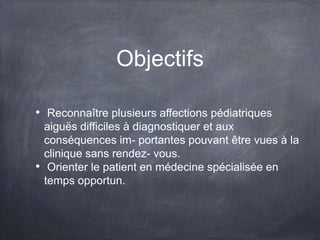 Le document présente des diagnostics critiques à ne pas négliger aux urgences pédiatriques, en se concentrant sur des cas tels qu'un mal de gorge avec suspicion d'abcès rétro-pharyngé. Il souligne l'importance de reconnaître des affections aiguës particulières et de diriger les patients vers un traitement spécialisé en temps opportun. Un point clé est de garder à l'esprit la possibilité d'un abcès rétro-pharyngé chez les jeunes patients présentant des difficultés à avaler.