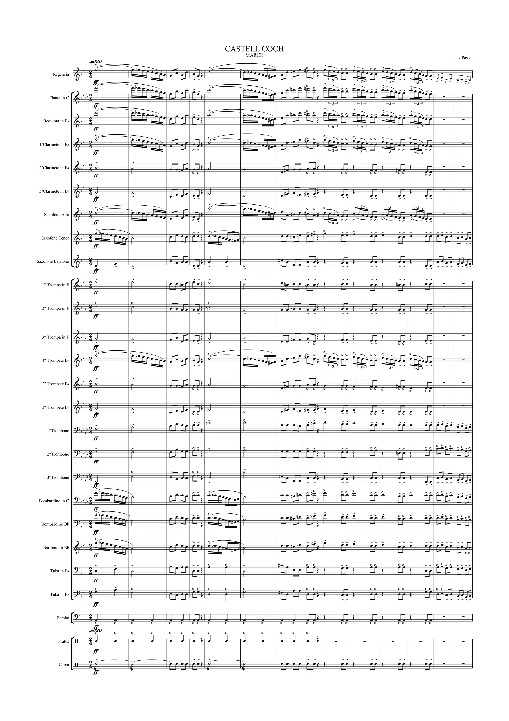 Le document présente des partitions de musique pour divers instruments, incluant des clarinettes, des saxophones, des trompettes, et des percussions. Chaque instrument est référencé avec des notations spécifiques pour la performance. Il s'agit d'une composition orchestrale, probablement destinée à un concert ou une répétition.