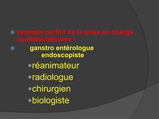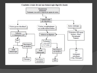 Le document traite de la prise en charge des hémorragies digestives en soulignant l'importance d'une approche multidisciplinaire. Il décrit les différents types d'hémorragies, leurs critères de gravité, et les mesures d'urgence à prendre, ainsi que les traitements endoscopiques et chirurgicaux possibles. Les définitions et classifications des hémorragies, ainsi que les protocoles de réanimation et de diagnostic, sont également abordés, insistant sur leur impact vital.
