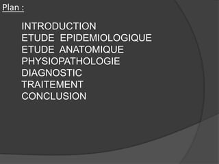Le document traite de l'invagination intestinale aiguë (IIA), une urgence médico-chirurgicale prédominante chez les nourrissons. Il présente des aspects épidémiologiques, anatomiques, physiopathologiques, ainsi que les méthodes de diagnostic et de traitement, incluant les indications pour la chirurgie et les différents types d'IIA. Les complications et les critères de réduction en cas de traitement conservateur sont également abordés.