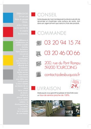 Desbuquois S.A., une filiale du groupe Vissal, propose une large gamme de produits de fixation prêts à vendre, notamment en visserie et boulonnerie. Le catalogue présente diverses options d'emballage et de conditionnement pour répondre aux besoins des clients, tout en assurant un service de livraison efficace. Leur concept de linéaire moderne vise à optimiser les ventes et la rentabilité dans le secteur de la distribution.