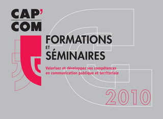 Le document présente des formations et séminaires orientés sur le développement des compétences en communication publique et territoriale, adaptés aux besoins des collectivités et organismes publics. Ces programmes incluent des formations pratiques, des séminaires de haut niveau, et un accompagnement personnalisé pour faciliter l'apprentissage en groupe. Cap’com offre également des ressources en ligne et un réseau de professionnels pour enrichir l'expérience d'apprentissage.