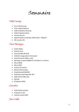 Le document contient un catalogue de matériel disponible au centre social de Nangis, détaillant une large gamme d'équipements audiovisuels, instruments de musique, et matériel de cuisine. Chaque item est accompagné de caractéristiques techniques et d'une caution à payer pour son emprunt. Les catégories incluent des vidéos, sonorisation, éclairage, jeux vidéo, et équipements pour événements.