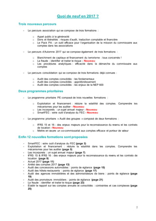 En 2017, de nouveaux parcours de formation ont été mis en place pour les commissaires aux comptes, incluant des thèmes tels que le blanchiment de capitaux, la fraude et l'audit des comptes consolidés. Des programmes prioritaires ont été introduits pour traiter des opérations de couverture et des actifs incorporels, avec un accent sur la compréhension des nouvelles réglementations et l'optimisation des processus d'audit. La formation vise à doter les participants des compétences nécessaires pour analyser efficacement les données financières et utiliser des outils tels que SmartFEC dans leur démarche d'audit.