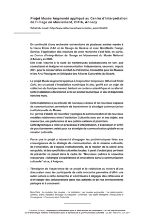 Le projet du musée augmenté, dirigé par Catherine Schwarz, met en avant une installation numérique in situ pour l'exposition 100 ans d'Emile Cohl, liant innovation et communication culturelle. Cette initiative vise à transformer les relations entre les musées et leurs publics en intégrant de nouveaux espaces de communication et en engageant activement les visiteurs. L'événement 'la com fait son festival' à Avignon servira de plateforme pour partager les expériences et les réflexions sur cette évolution des pratiques muséales.