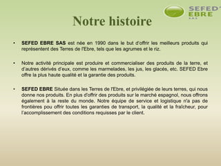 Sefed Ebre SAS, fondée en 1990, se spécialise dans la production et la commercialisation de produits agricoles tels que les agrumes, le riz et des dérivés comme les jus et confitures, en garantissant la qualité et la fraîcheur. L'entreprise distribue ses produits à la fois sur le marché espagnol et à l'international, avec une attention particulière portée sur un service logistique efficace. Ce document inclut également un catalogue de produits avec leurs références et prix.