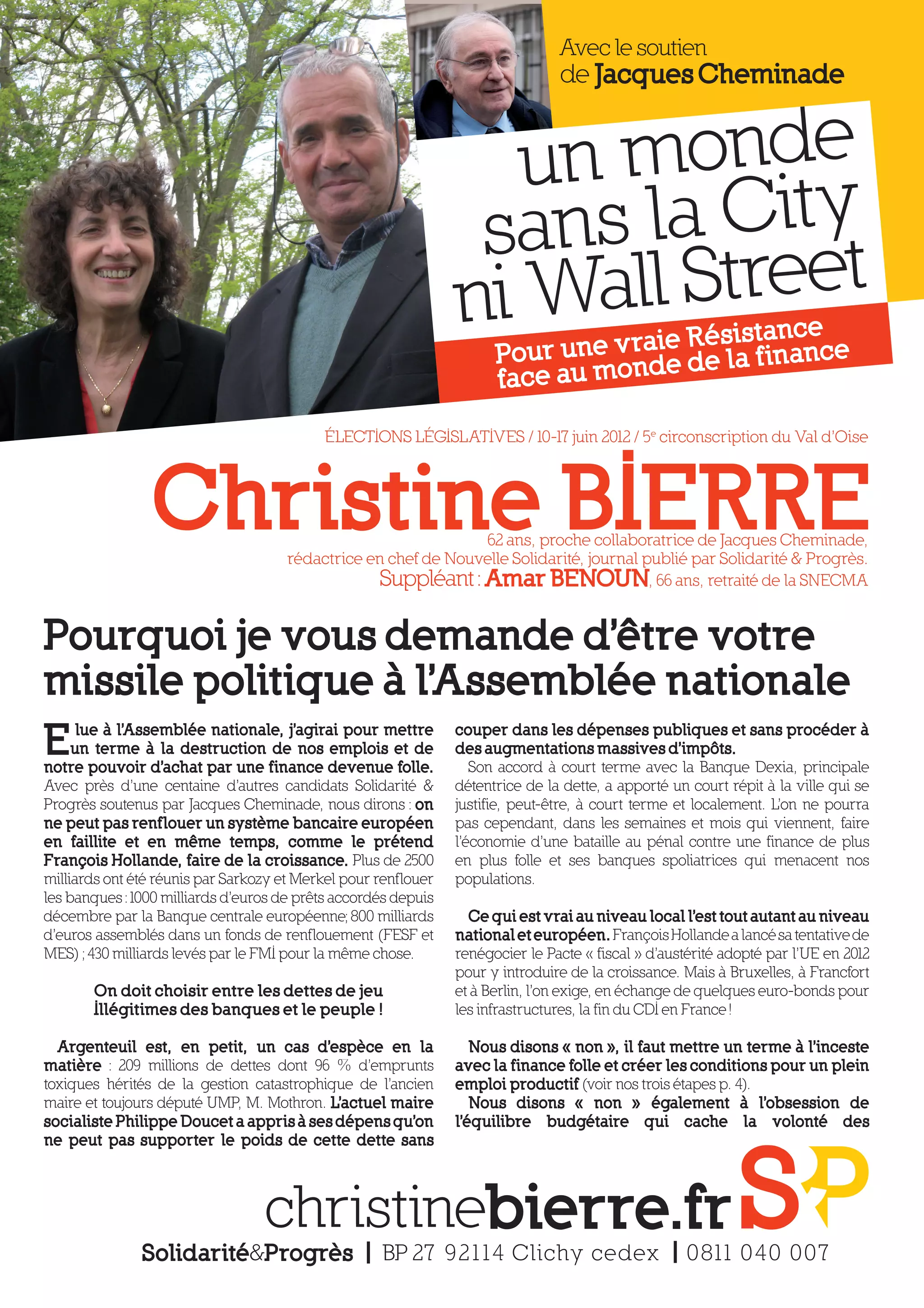 Le document présente la candidature de Christine Bierre pour les élections législatives de 2012, soutenue par Jacques Cheminade, afin de lutter contre l'austérité et la domination de la finance sur l'économie française. Il critique la politique économique actuelle, dénonçant le renflouement des banques et l'impact néfaste de l'austérité sur les populations les plus vulnérables. Le message clé appelle à une réindustrialisation, à la création d'emplois qualifiés et à une réforme de la finance pour protéger les citoyens contre les abus du système financier.