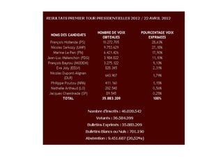 Le premier tour des élections présidentielles de 2012 en France a enregistré 46 028 542 inscrits avec un taux d'abstention de 26,34%. François Hollande a obtenu 28,63% des voix, suivi de Nicolas Sarkozy à 27,18% et Marine Le Pen à 17,90%. Des erreurs ont été notées, car le nombre d'inscrits identifié devrait être de 46 036 086.